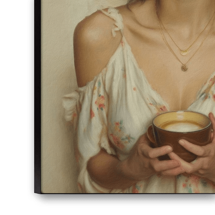 This is a digitally produced painting, a romantic, tender and atmospheric fantasy portrait of a young woman with her mug of coffee.