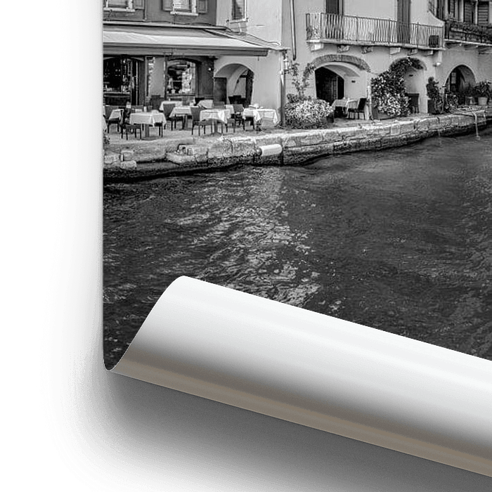 Buy this landscape artwork Summer at the harbour of Malcesine on Lake Garda. Black and white image. by Manfred Voss, Black-White Photography on canvas, ArtFrame, poster and wallpaper, printed on demand in high quality.