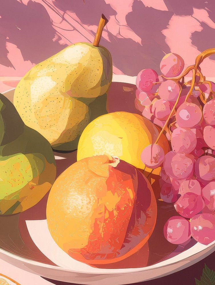 This artwork exudes warmth, softness and elegance. On a sunlit table is a bowl of ripe pears, an orange, a lemon and a bunch of pink grapes. In the foreground lies an orange cut open, gleaming in the soft light. The background is filled with warm shades of pink and subtle shadows of leaves, giving the scene a dreamy, summer atmosphere.