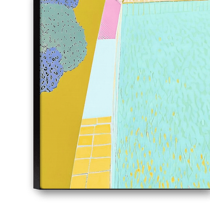 This semi-abstract painting shows a soothing image of a summer pool surrounded by a lush green garden. It is a wonderfully peaceful spot and there are no people in sight. The sunny painting is square in shape and exudes a serene atmosphere. It is perfect for hanging in a calming space where you can relax and enjoy the soothing images the painting evokes.