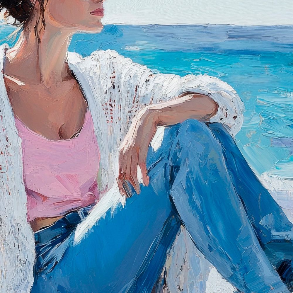 In a moment of perfect stillness, an impressive woman enjoys the gentle waves of the sea. Her sunglasses reflect the light of the sun, while the white jumper over her delicate top flutters gently in the wind. Barefoot and deeply relaxed, she sits on the rocks, her gaze fixed on the horizon where sky and water merge.