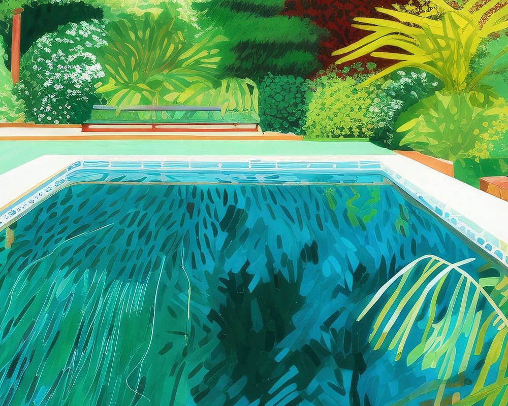 The palette consists of different shades of green, blue and turquoise. Layers of dark blue, emerald and cyan are visible in the water, with reflections in light tones. The vegetation includes shades from light green to deep green, with accents in yellow-green and red-brown. The tiles along the pool are white with patterns in blue, combined with borders in terracotta and pink-beige. The benches show woody colours with grey and green elements.