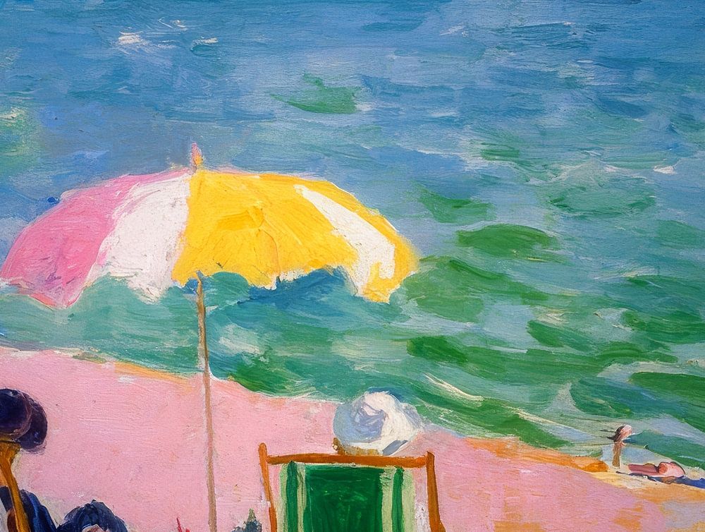 Under brightly coloured umbrellas, beachgoers enjoy a restful day by an azure sea, framed by rolling hills and pastel colours. This painting exudes light, airiness and summery carefreeness, in a style full of expressive brushstrokes.