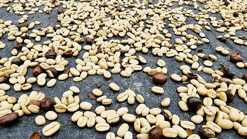 The drying process. The primary focus is on a dense scattering of pale, creamy yellow or off-white beans that are spread in a thin layer over a dark, textured mat or tarp.