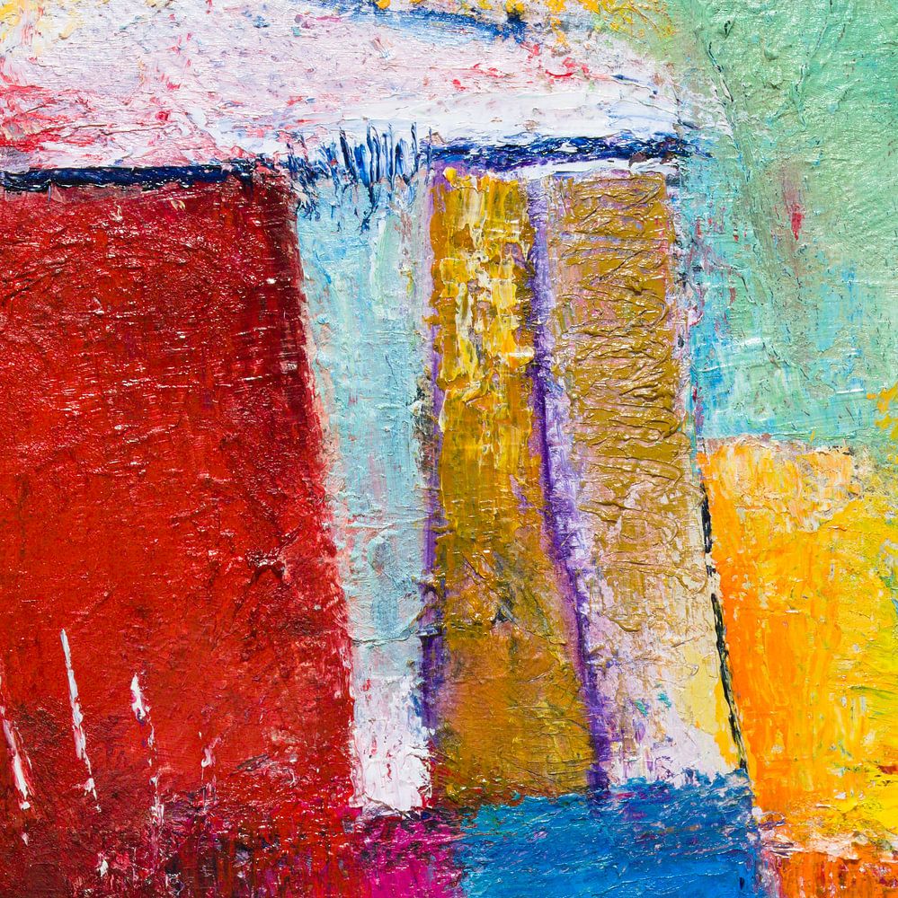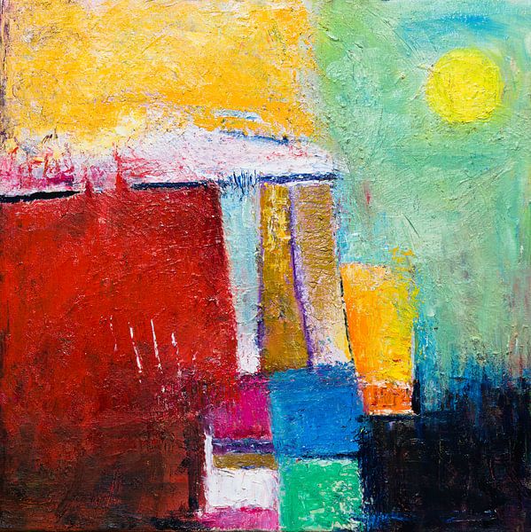 A painting with coloured areas, subtly combined with the suggestion of the sun or moon. Unleash your imagination on this canvas. It is painted with oil paint on a 50 x 50 cm canvas. You experience warmth, darkness, day, evening, city, buildings, sky, summer, autumn, winter and spring.