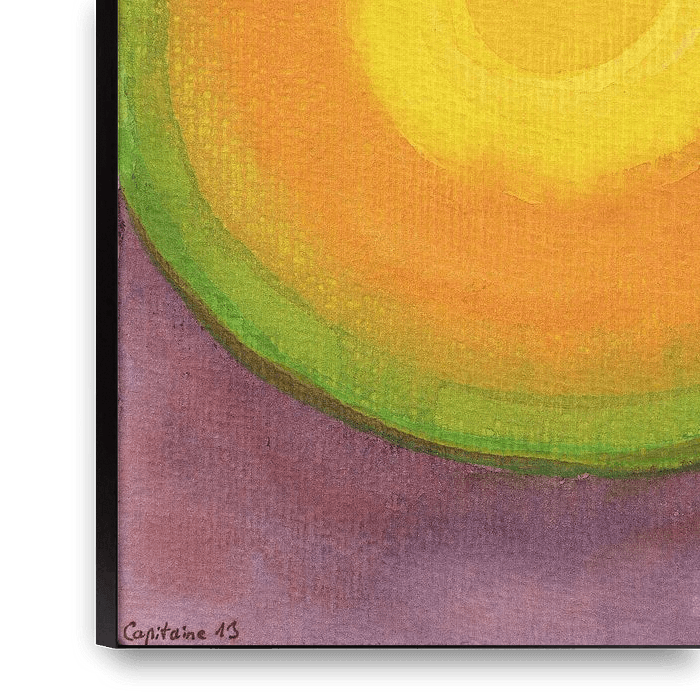 A radiating yellow sun with surrounding orange and green rings stands above a purple background. The colors are warm and soothing, the composition is clearly centered to the middle. It’s a wonderful image for meditation and contemplation.