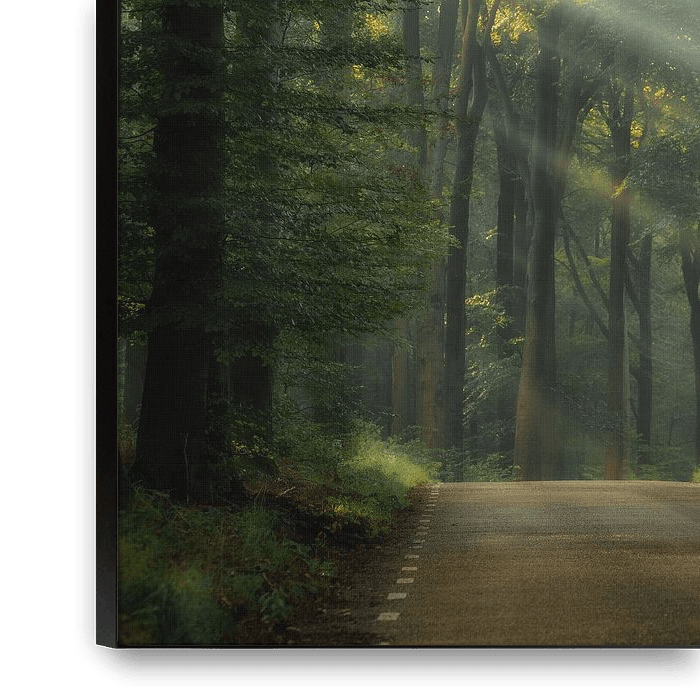 Beautiful sun harps in the forest of Hoog-Soeren. The harps shine beautifully on the leaves. The road is deserted and peace reigns. The atmosphere is fairytale-like.