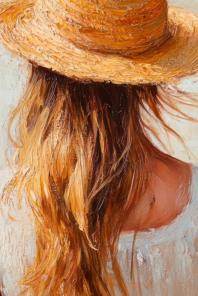 A gentle hint of summer wafts through the scene as golden sunlight dances into a young woman's long, bouncy hair. Her straw hat, slightly askew and full of character, protects her from the sun, while the light, airy fabric of her dress reflects the lightness of the moment. An image of calm and serenity.