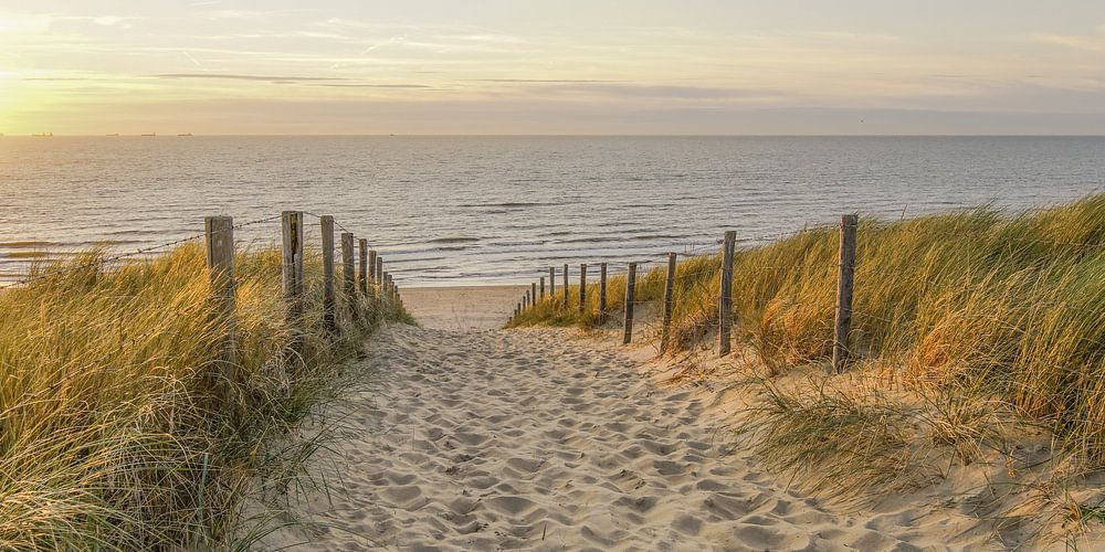The beach at the Dutch coast with the most beautiful sunsets, pounding waves and quiet beaches. Many of my pictures are taken between Katwijk and Scheveningen and Katwijk and Noordwijk. I myself am always moved by the many and beautiful cloudy skies, the sun poking through and then shining on the sea and the beach again. Living at the beach is living for me! Enjoy our beautiful nature! This beach entrance or beach turn gives you a wonderfully happy and free feeling all year round and only makes the longing for summer greater. Here shown as a panorama but can also be made in a 3:2 ratio.