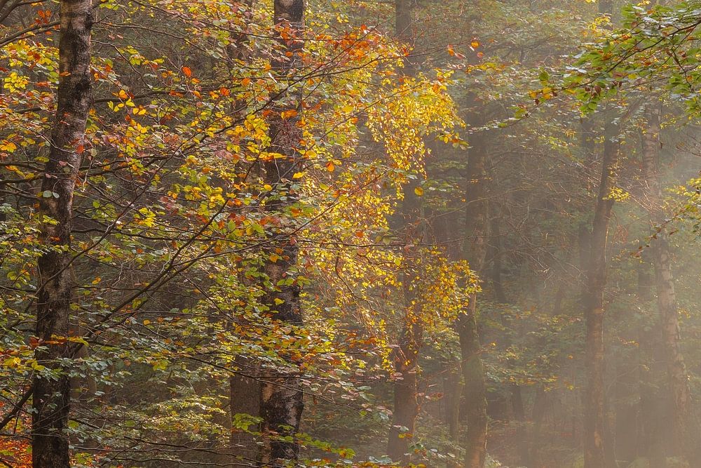 About "Sunbeams illuminate the ferns in the autumn forest"