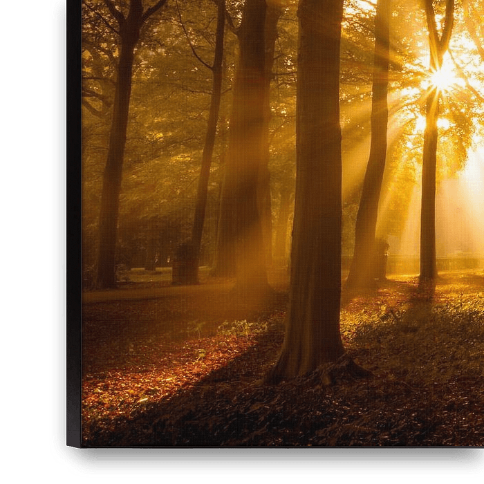A magical morning in the forest, the sun's rays shine through the beans and illuminate the mist in the forest. It is autumn in the Netherlands and the mist gives everything a golden glow.