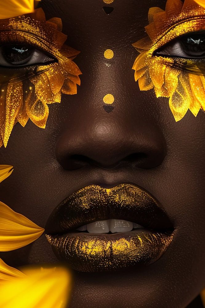 This impressive work of art shows the face of a woman framed by glowing sunflower petals. The intense yellow and gold tones contrast beautifully with her dark skin, while the ornate details and majestic presence of the woman create a captivating aura. This depiction combines natural beauty with artistic expression and is ideal for lovers of modern, colourful art. Perfect for adding a vibrant and inspiring touch to any room.