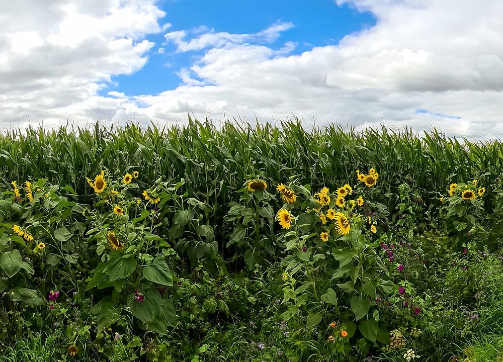 Sunflowers at the edge of a cornfield under dramatic sky