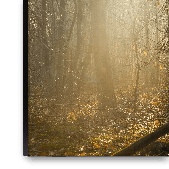 The light falls low through the forest and touches the trunks as if it wants to touch them for a moment. Fine rays stand out in the light mist, leaves light up, and the ground glistens softly. Everything in this image revolves around that one moment when light and silence meet.