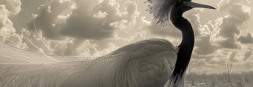 Discover the mesmerising beauty of this impressive image of a bird of paradise bathed in the golden light of the sun. This picture captures the majestic moment when the bird of paradise stands proudly and elegantly in a lush field, surrounded by a dramatic sky full of clouds. The bird's fanning feathers exude an ethereal beauty, enhanced by the subtle monochrome tones that give the image a timeless charm.