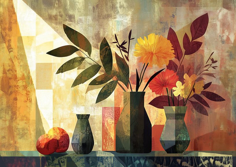 Sunlit Vase Duo - This floral painting is a modern Japandi still life featuring large geometric vases with tall dark green leaves and fiery yellow and red flowers alongside two round fruits in the foreground, all bathed in warm yellow-orange sunlight and rich texture — a perfect floral painting for a modern interior, also available as a…