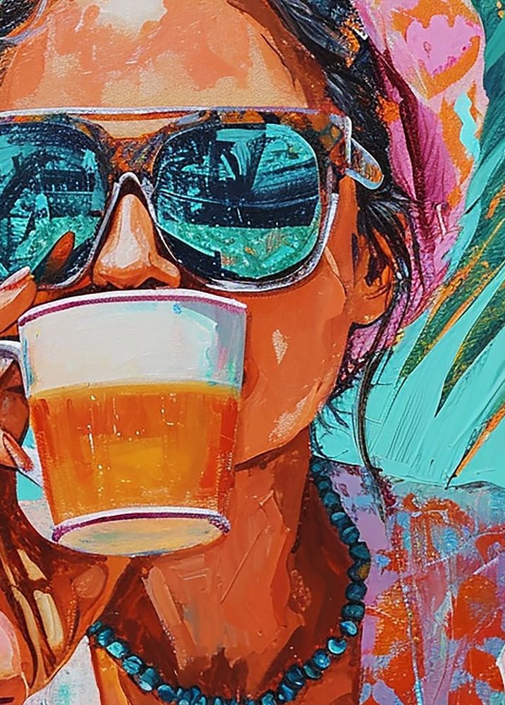 An illustration of a woman drinking tea in the sun, in the style of Mexican folklore-inspired, acrylic art. Cheerful, with pink and aquamarine hues, polychrome terracotta, with bold contrasts and playful textural play, creates a vibrant image. The whole exudes a playful, yet sophisticated atmosphere.