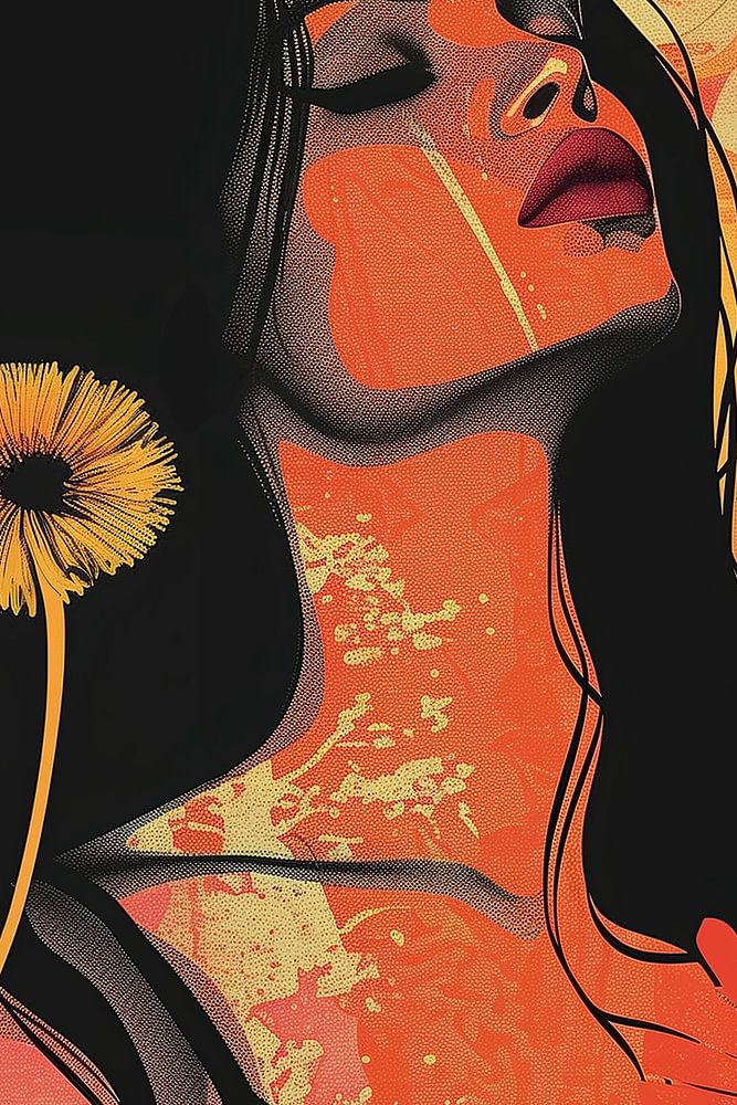Summery image of a woman with black hair, a black shirt and black frame against a red, orange and yellow background, decorated with flowers in a complementary colour scheme. Summery, cheerful and intense. Enjoying the sun and summer scents. Fitting various styles and trends, including, portrait, woman, summer, orange. Artist: Bianca ter Riet