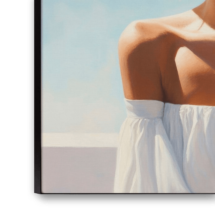 Gentle rays of sunlight hit a simple, elegant figure whose eyes are hidden by a shady straw hat. The white blouse drapes lightly over her shoulders, while the clear sky in the background creates an atmosphere of tranquillity and summer dreams. Here, style meets mysticism and the moment seems to stand still.