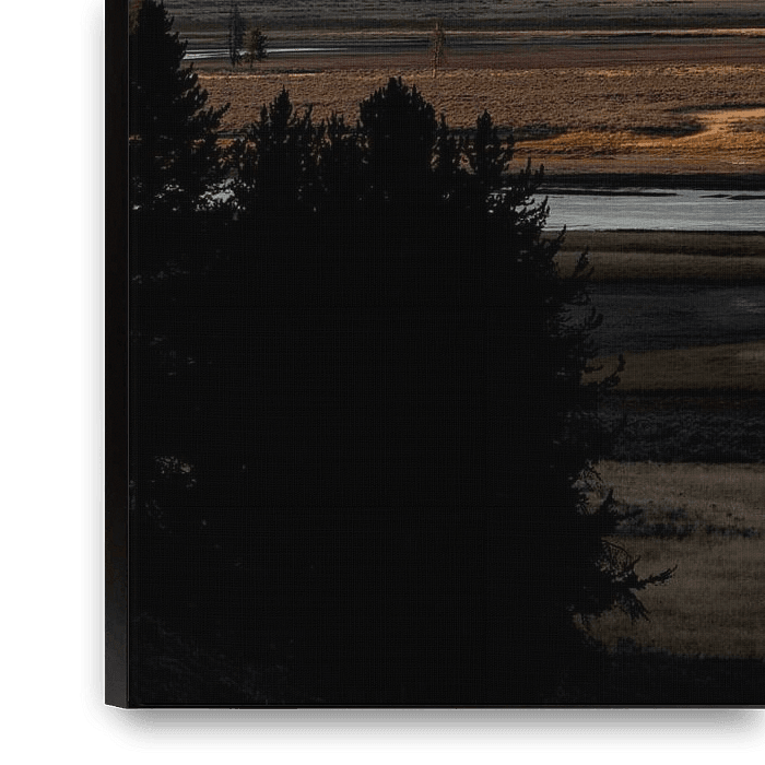 A layered photograph of the sunrise in Yellowstone National Park. The light emphasizes the different layers, the water, the grass, the mountains, the trees.