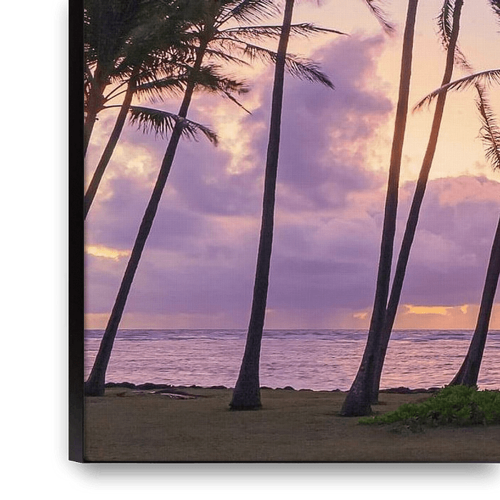A 16:9 photo of a colourful sunrise at Kapaa beach park with palm trees overlooking the vast ocean.