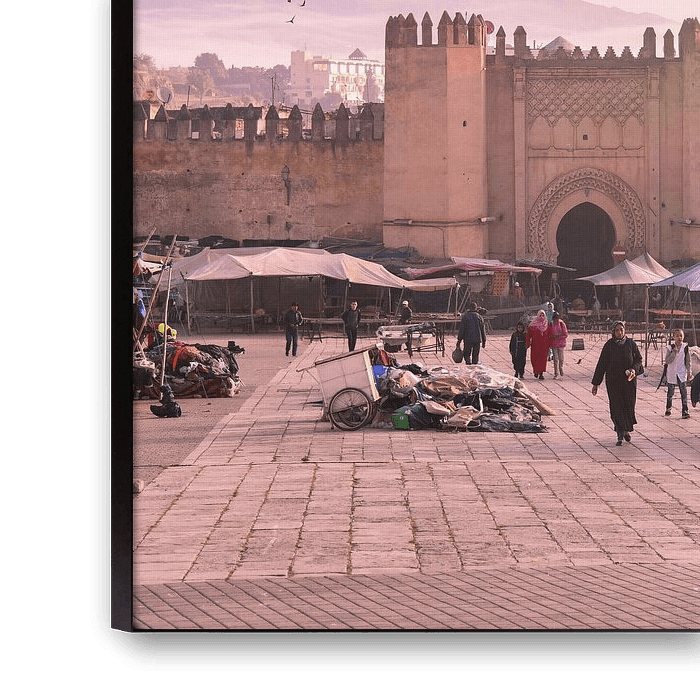 The sun rises over the medieval traditional city gate of Fez in Morocco. The morning market is just starting up. The sky turns pink in the first light. The serene atmosphere is like silence before the storm. A few hours later, the hustle and bustle of the market and the city will erupt, but during the morning hours, there is a complete calm.