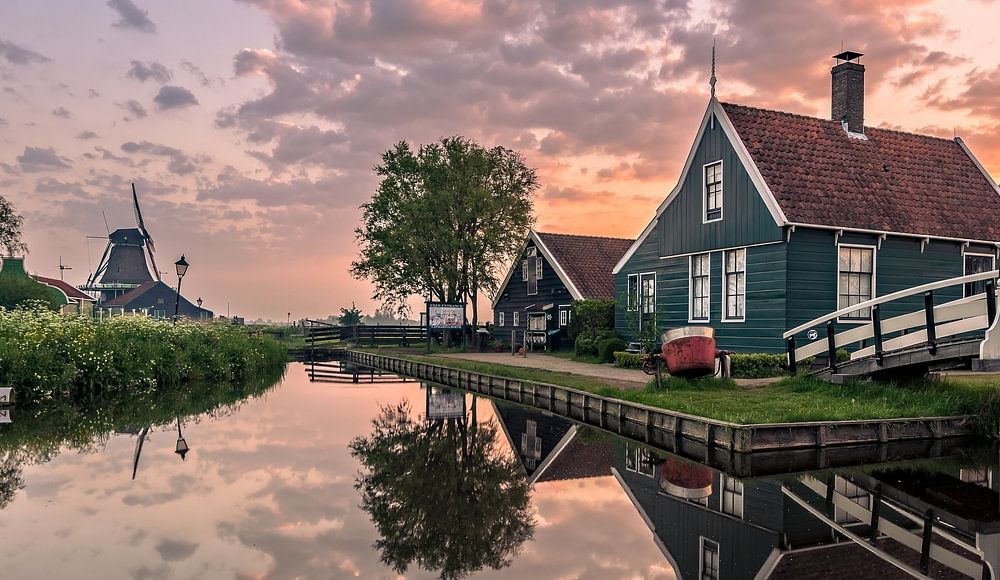 The idyllic Zaanse Schans museum village and open-air museum in the north of Holland shortly after sunrise