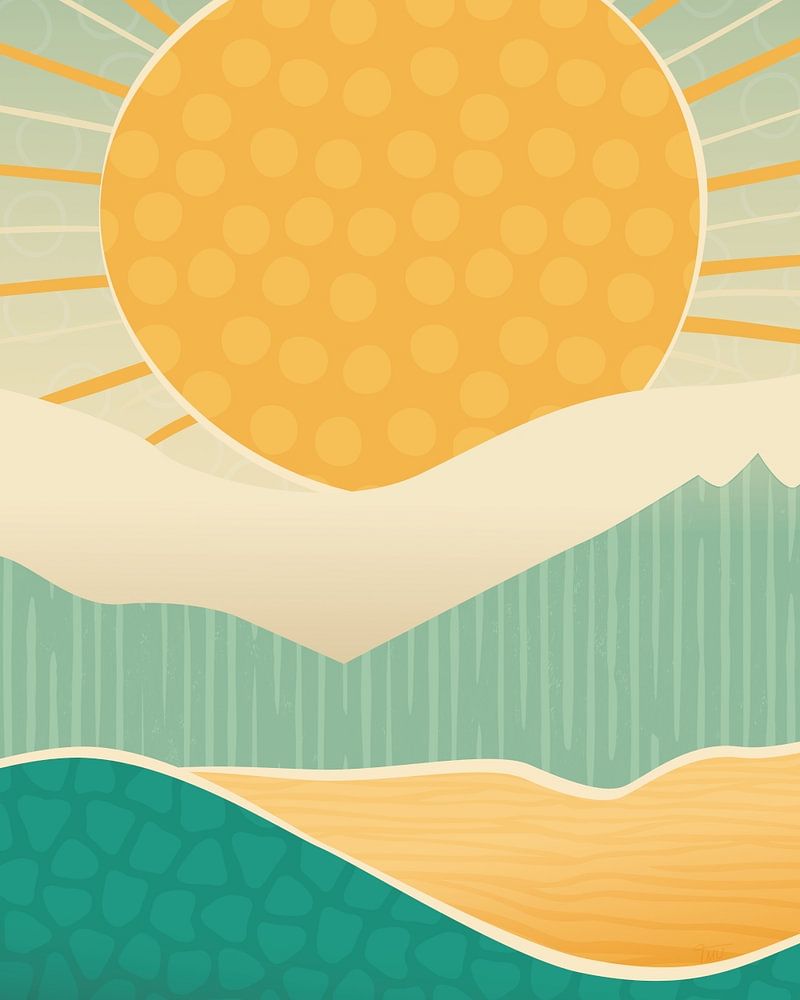 Abstract-minimalist landscape featuring fields, mountains and the rising sun in the background. The iconic sun rays give the illustration a hint of retro-style. The colors - shades of yellow, orange, red, green and turquoise - stand for the contrast between the warmth of the sun and the cool shadows of the night. Various graphic elements and textures ensure interesting effects.