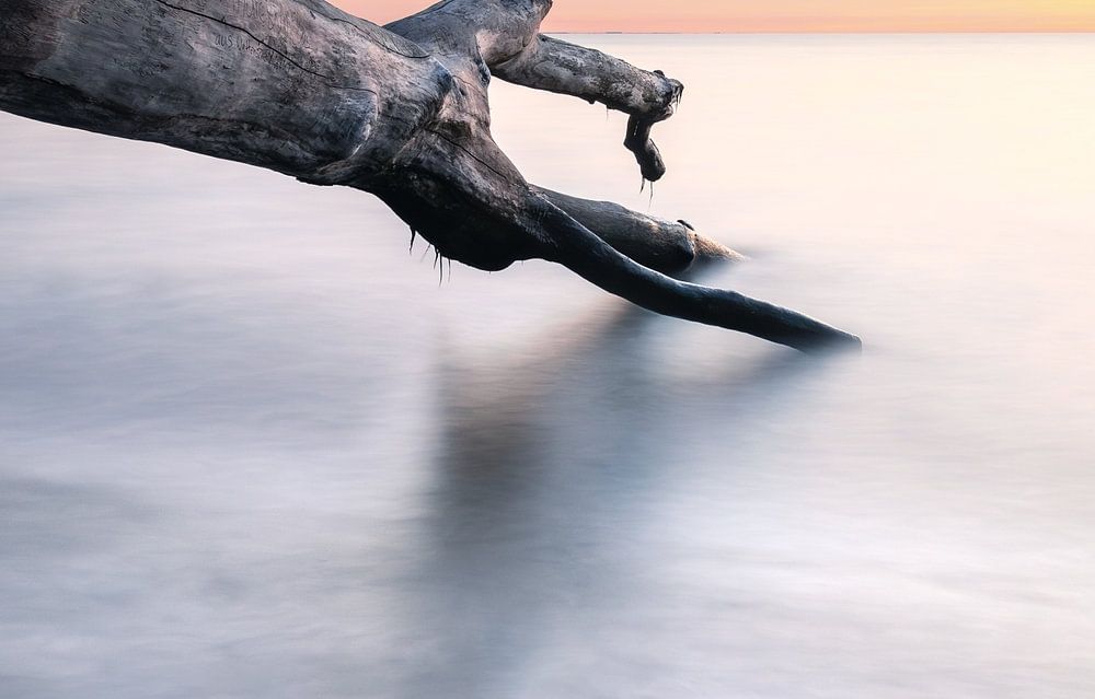 The beach of Lübeck-Travemünde on the Baltic Sea is known for its picturesque beauty. The picture shows the untouched beauty of nature in this popular coastal resort. The fallen tree in the foreground adds a certain uniqueness to the composition and conveys a touch of mysticism.