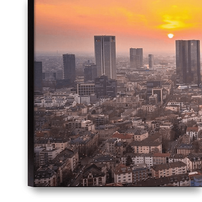Buy the photo Sunrise over Frankfurt skyline by Fotos by Jan Wehnert on canvas, ArtFrame, poster and wallpaper, printed on demand in high quality.