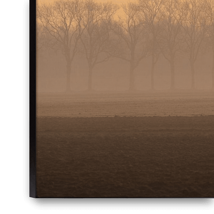 Buy this landscape artwork Sunrise over a field, mound with shed. Netherlands. by Ronald Harmsen on canvas, ArtFrame, poster and wallpaper, printed on demand in high quality.