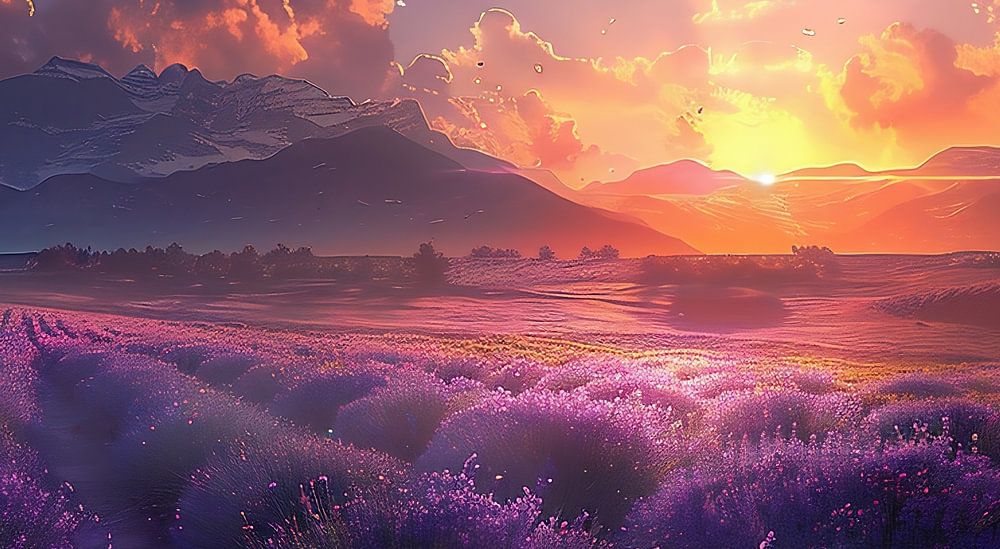 Buy this landscape artwork Sunrise whispers in the lavender by fernlichtsicht on canvas, ArtFrame, poster and wallpaper, printed on demand in high quality.
