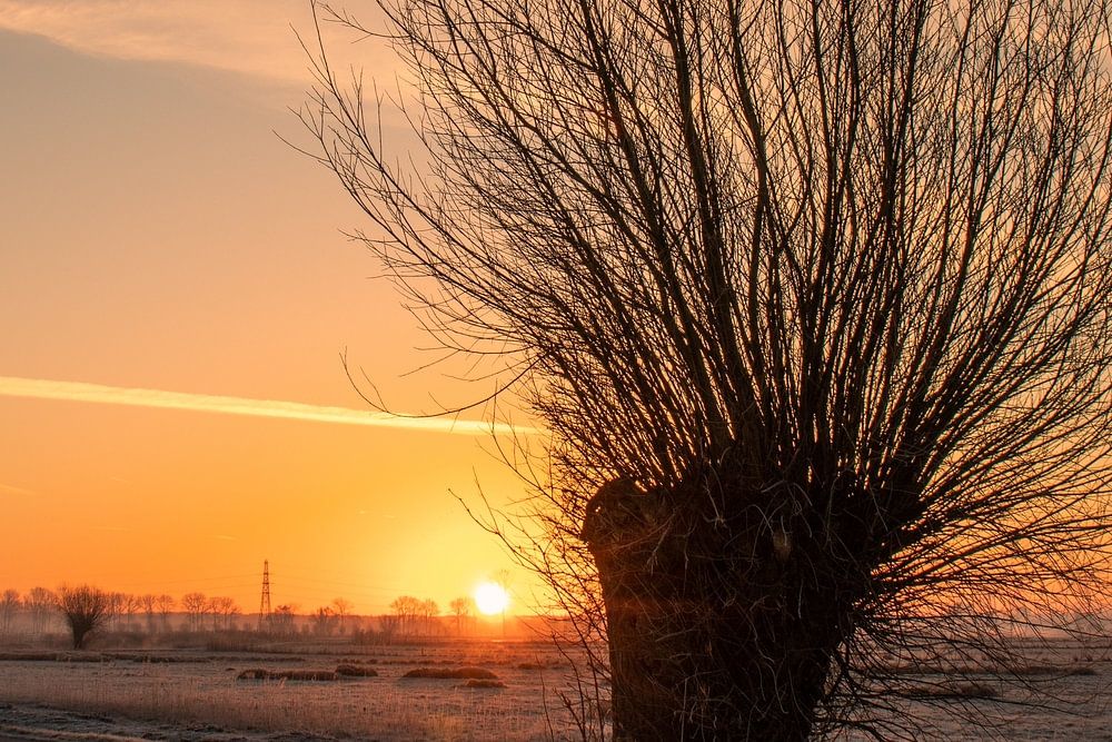 Sunrise with a beautiful atmosphere in the Binnenveld between Veenendaal, Ede. Wageningen and Bennekom in the Netherlands. A beautiful sky with a Pollard Willow in front of it.