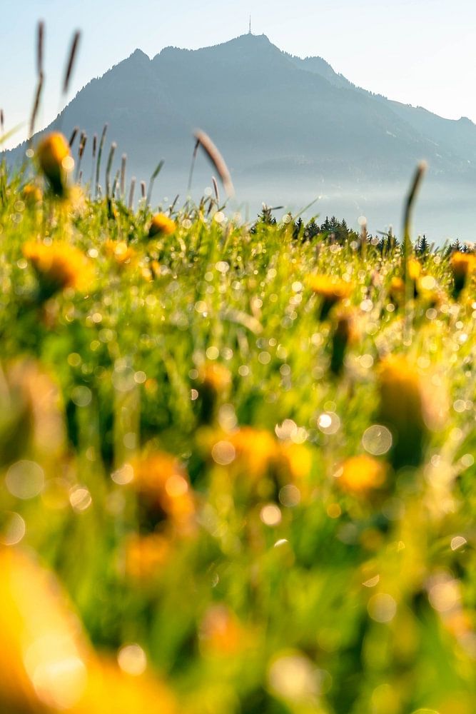 Buy this flower art Sunrise with view of the Grünten by Leo Schindzielorz on canvas, ArtFrame, poster and wallpaper, printed on demand in high quality.