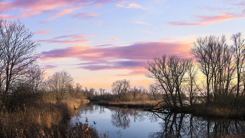 Magical moment in the Biesbosch: reflecting creek surrounded by reeds and silhouetted trees under a pink-purple sunset.