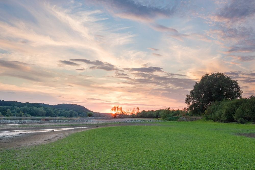 Sunset Elbe River in Germany with a patch of clouds and young grass in the foreground