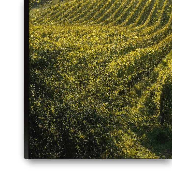 The foreground is dominated by cultivated vineyards whose rows follow the natural contours of the hill, bathed in the warm light of the setting sun.
