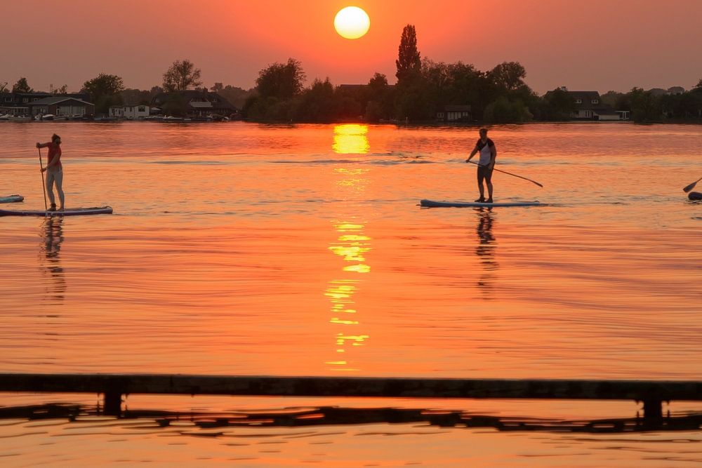 Group of people on their paddle boards on a lake in the Netherlands against a beautiful sunset