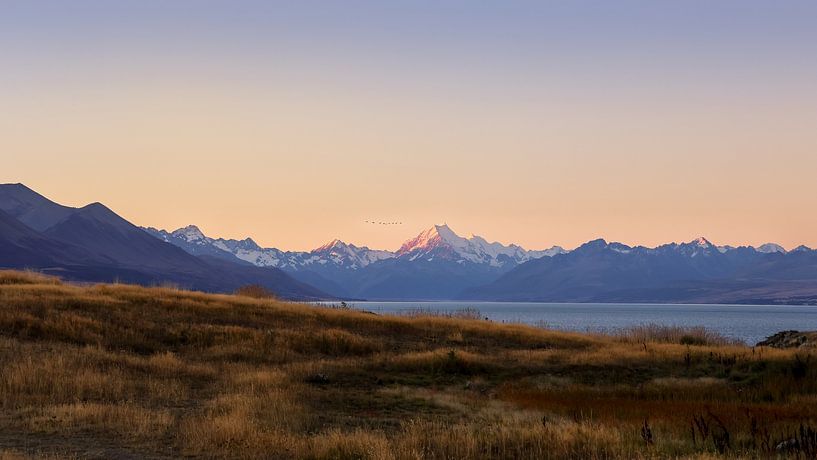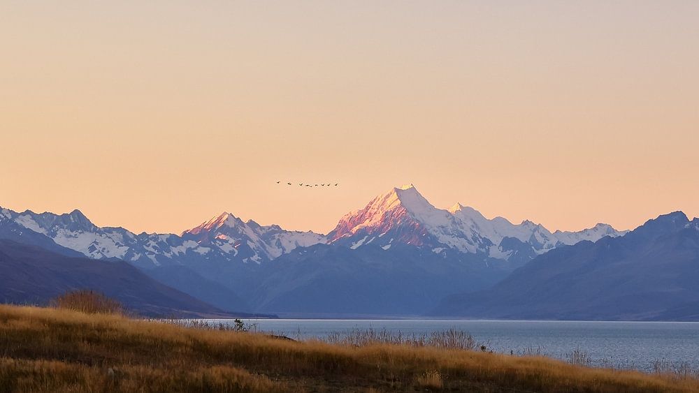 One evening, we were staying at a motorhome site near the famous Lake Tekapo on New Zealand's South Island. The view we had there was breathtaking, with the sun setting behind the mountains. I looked for a good position and took this photo at the perfect moment, with some birds flying next to the mountain. The photo has a warm feel…