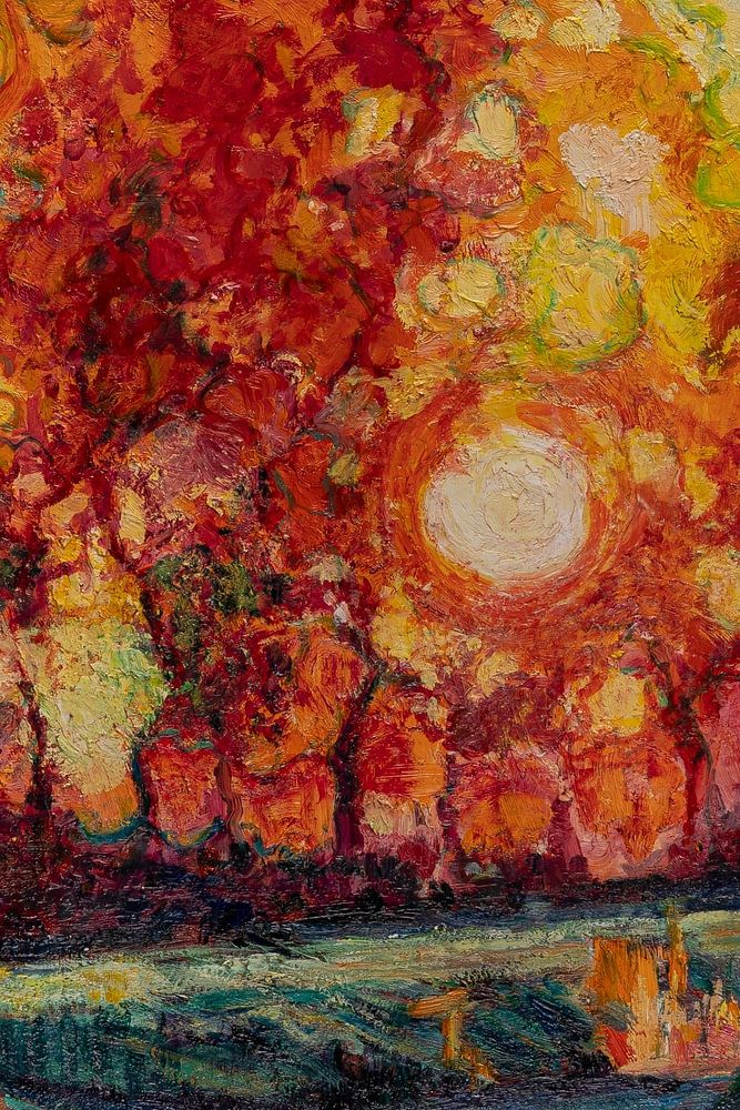 A monumental autumn landscape in which nature seems to be ablaze. Towering trees in deep red, orange and gold dominate the scene, while a low sun makes its way through the foliage. The light reflects beautifully in a tranquil watercourse that winds its way through green banks — a play of fire and water that makes the canvas vibrate. The…