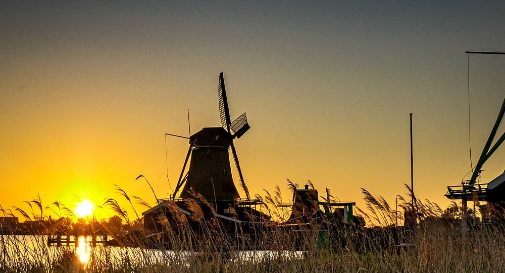 Sunset at the famous Zaanse schans in Zaandam at the end of a warm, beautiful day.