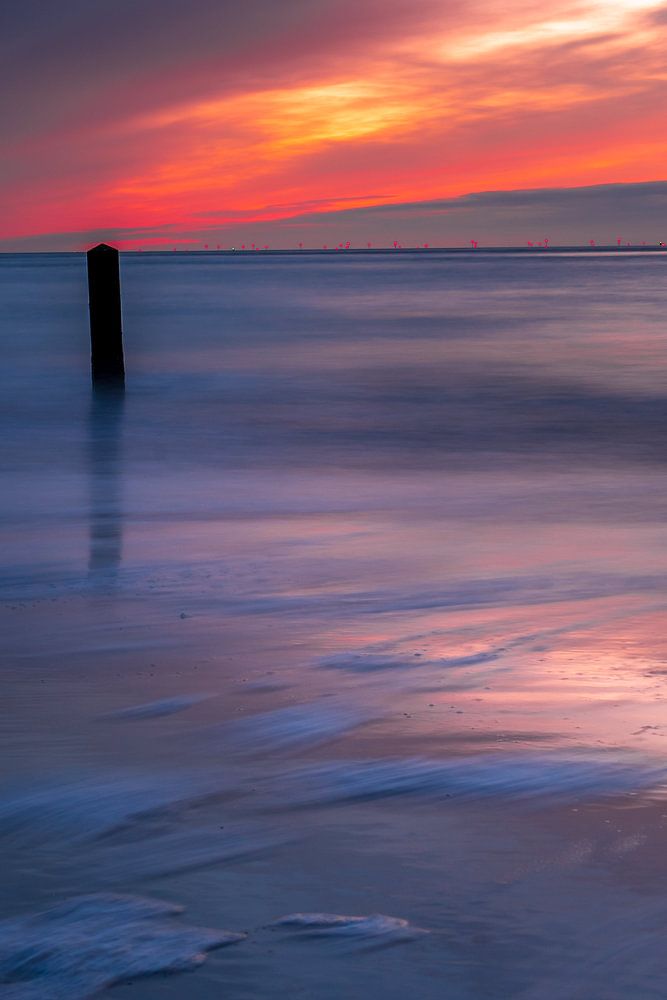 The clouds in the sky are still glowing from the sun that has just disappeared below the horizon. The light is very nicely reflected by the water. The long shutter speed makes the water seem to flow around the beach pole like mist.