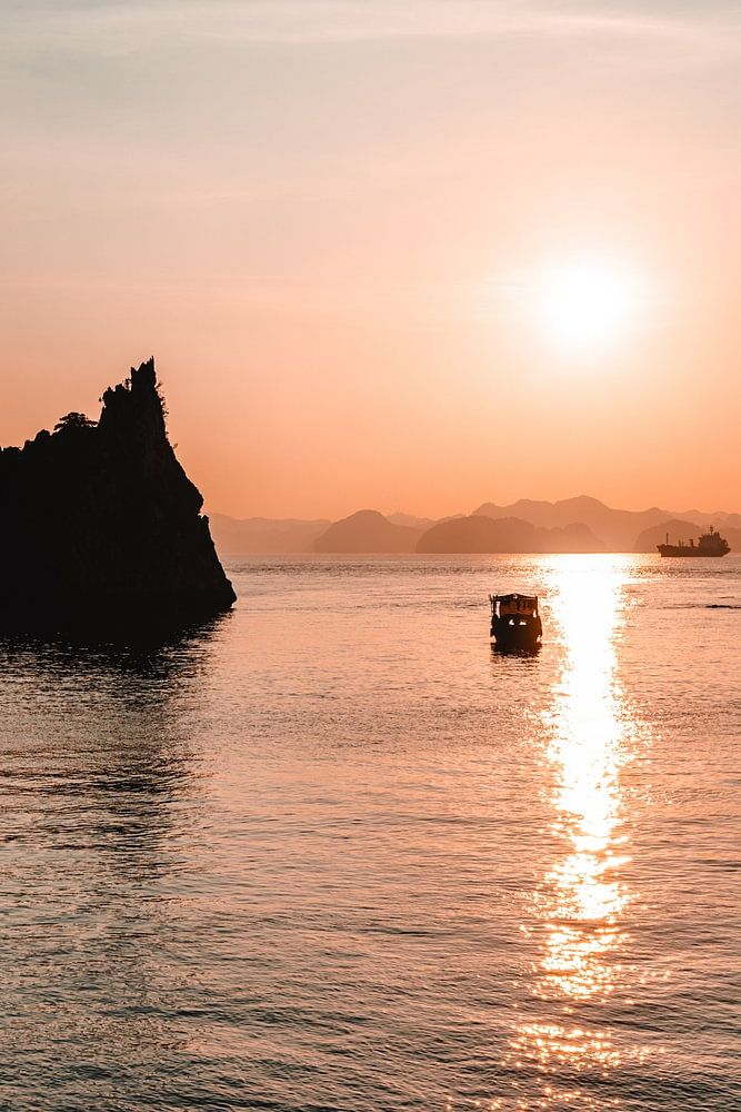 Photo from the water in ha Long Bay in vietnam. Taken during sunset, you can see the sun very low with warm colours of sunset and you can also see some of the more of 1000 islands of Ha long Bay in Vietnam