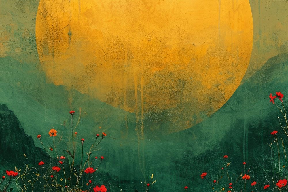 Sunset in a modern abstract landscape. Poppies in the foreground and a setting or rising sun in a green landscape.