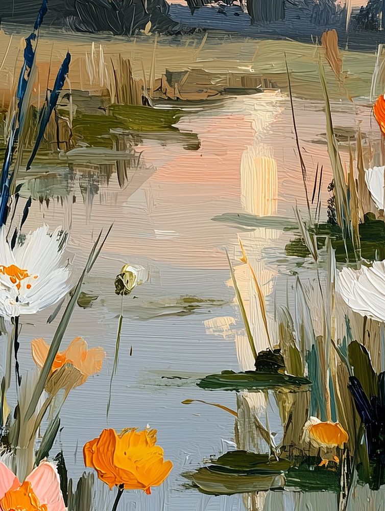 This landscape shows a quiet marsh lake at the moment when the sun fills the evening sky like a pale orange disc. The water reflects the soft peachy pink of the sky, while lily pads and reeds form a natural frame. In the foreground, white, salmon-pink and bright orange flowers grow among tall, golden-brown grass stalks; their impasto paint strokes stand out palpably against the serenely blue water. At the back, silhouettes of oaks and willows catch the last light and add depth to the scene. This print brings a sense of calm and rural expanse, ideal for spaces where you want to relax or dream away: over a bathtub, behind the sofa or in a yoga studio. In an office corner, the marsh landscape brings nature inside and works to slow down in hectic days. Combine with accessories in loam green, cream or burnt orange and add a wicker basket or a linen plaid to subtly extend the nature theme. A narrow brass frame adds a chic touch; a wooden frame, on the other hand, emphasises the outdoor feel.