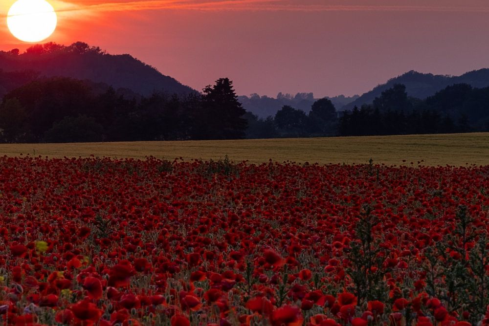 Buy the photo Sunset over a poppy field by Andreas Müller on canvas, ArtFrame, poster and wallpaper, printed on demand in high quality.