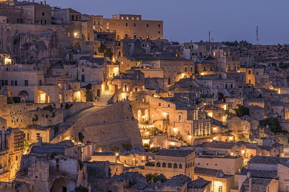 As daylight fades, the ancient city of Sassi di Matera lights up. The stone houses and narrow alleys sparkle gently against the evening sky.