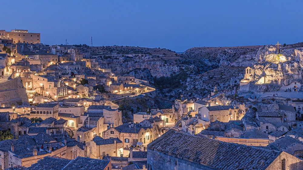 As daylight fades, the ancient city of Sassi di Matera lights up. The stone houses and narrow alleys sparkle gently against the evening sky.