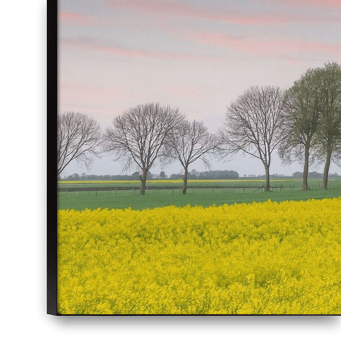 Buy the photo Sunset over rapeseed fields with Borg by Hillebrand Breuker on canvas, ArtFrame, poster and wallpaper, printed on demand in high quality.