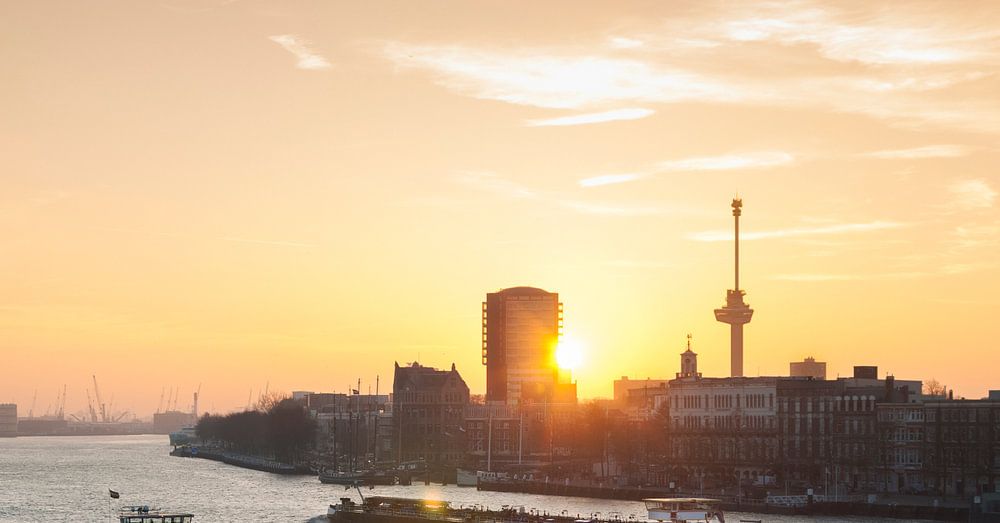 Sunset over the river Meuse with two ships passing in the foreground and the Euromast in the background,
